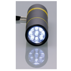 Made of lightweight Aluminum, our compact 9 LED Flashlight is a great choice for any promotion. The lanyard or wristlet makes it easy to carry. Available in three material colors. Includes 3 AAA batteries.
