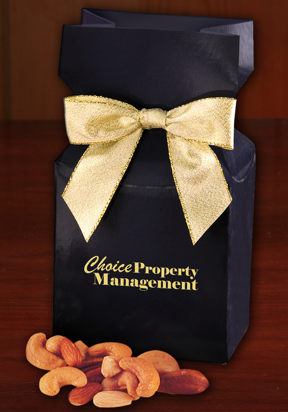 This stylish, dark navy blue gift box is the perfect solution when you are looking for a food gift as a table favor or small thank you gift, especially for trade shows, meetings, or a holiday. Each box opens to reveal five-ounces of our freshly roasted Deluxe Mixed Nuts. Your logo is foil-stamped in gold or silver on the front of the box, and includes a matching bow.