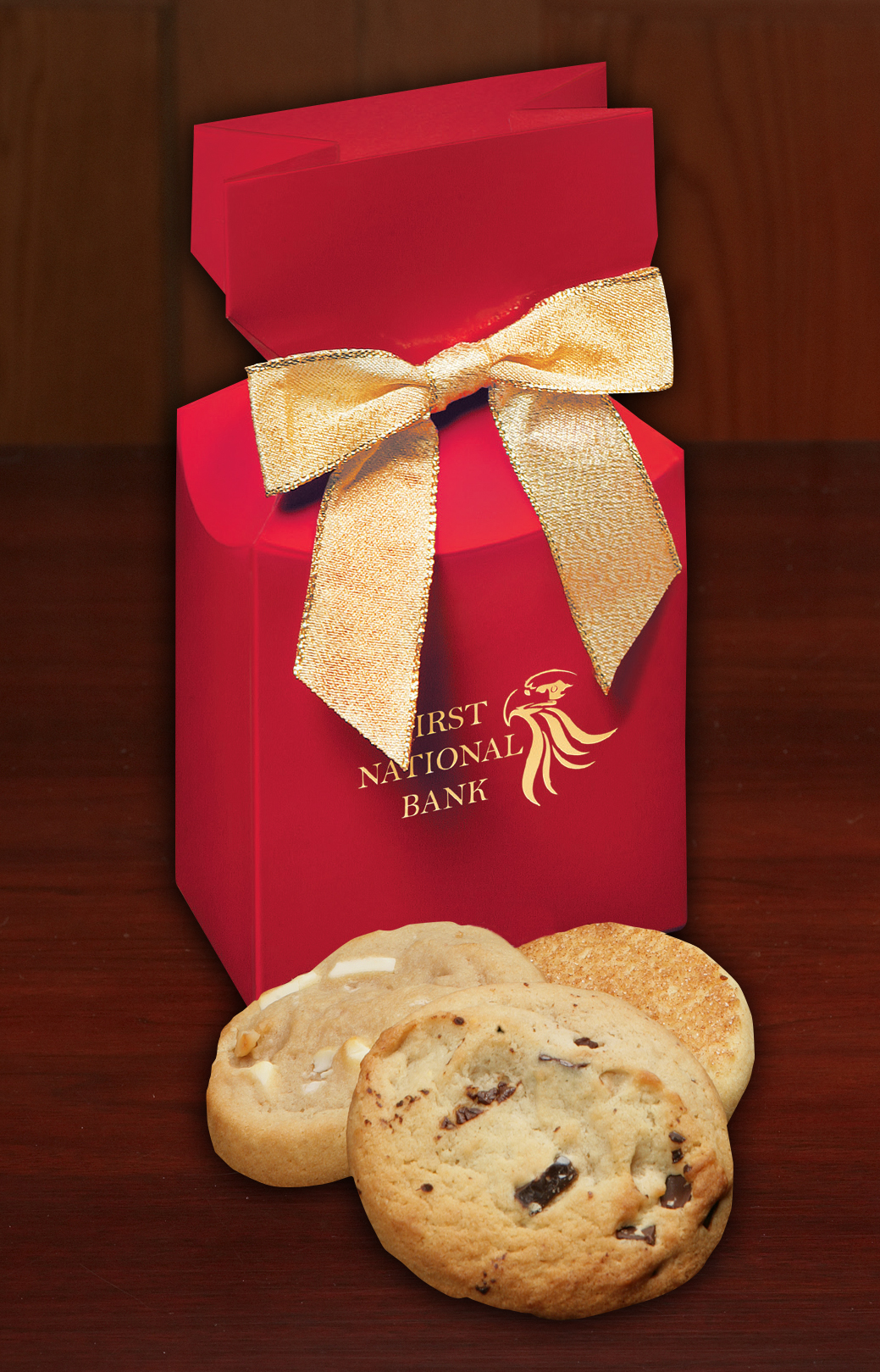 Packed with our decadent old-fashioned Home-Style Cookies – White Chocolate Macadamia, Chocolate Chunk & Snickerdoodle, these fashionable packages make a great thank you gift. Make a statement with our bright red boxes imprinted in either silver (with silver bow) or gold (with gold bow).
