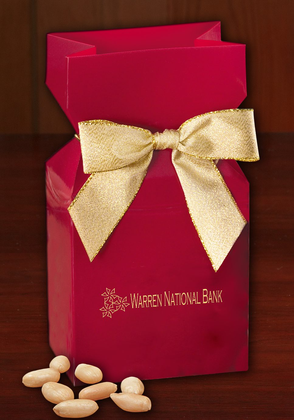 This stylish, bright red gift box is the perfect solution when you are looking for a food gift as a table favor or small thank you gift, especially for trade shows, meetings or a holiday. Each box opens to reveal six-ounces of our Choice Virginia Peanuts. Your logo is foil-stamped in gold or silver on the front of the box, and includes a matching bow.